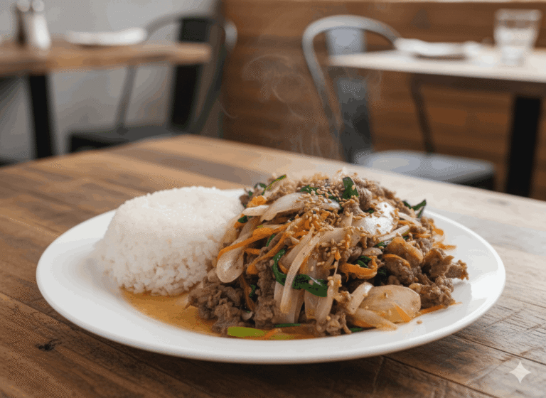 Carne de cerdo picante con verduras al estilo coreano sobre arroz caliente