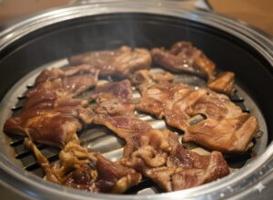 Costilla de cerdo a la parrilla con un sabor agridulce y salado con guarnición y arroz blanco